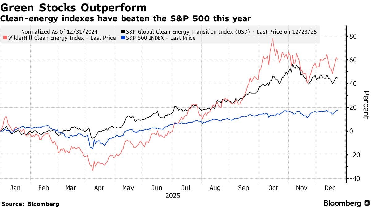 Clean-energy indices surged 45-60% in 2025, vastly outperforming the S&P 500, as global green bond and loan issuance hit a record $947B. AI-driven electricity demand pushed investors towards infrastructure plays, with Asia-Pacific leading at $261B raised (+20% year-on-year) and China recording $138B in green bonds, as BNP Paribas predicts easing US rates could boost global green bond sales to $1.6T in 2026. Source
